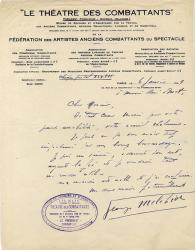 MELCHIOR GeorgesLettre autographe signée, adressée au journaliste René Brest. Paris, 6 janvier 1939 ; 1 page in-4°. En-tête imprimé « Le Théâtre des Combattants ».« De tout coeur merci pour votre grande amabilité, votre accueil chaleureux. je pense ne pas vous avoir trop importuné par mes longs bavardages. [ ] Ma mission est noble et jai confiance. »