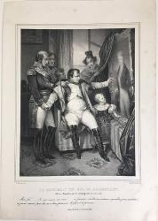 NAPOLÉON Ier (Napoléon Bonaparte)Gravure représentant Napoléon recevant le portrait du duc de Reischtadt à Sainte Hélène. Lithographie de Lemercier d'après Nicolas Maurin (1799-1850). XIXe siècle ; 42,5 x 30 cm. Infîmes piqures. Dans le salon de Longwood, le général Gourgaud, le général Bertrand, la femme de ce dernier et ses enfants, entourent Napoléon assis, qui regarde un grand portrait de son fils.