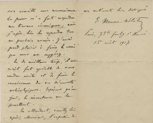 MOREAU-NÉLATON ÉtienneLettre autographe signée. Paris, 15 août 1917 ; 2 pages 1/2 in-8°. « Votre lettre vient de m'être retournée à Paris, où je suis actuellement. J'apprécie l'intérêt que vous accordez à mon histoire de Fère en Tardenois, et je me fais un plaisir de vous en adresser un exemplaire. Je vous remercie de me faire connaître vos trouvailles d'émaux et de verreries remontant à l'époque gallo-romaine. Elles me touchent particulièrement et l'envoi que vous me proposez sera accueilli avec reconnaissance. La guerre m'a fait suspendre mes travaux céramiques ; mais j'espère bien les reprendre dans un prochain avenir. J'aurais grand plaisir à faire les essais que vous me suggérez. Dans de meilleurs temps, il me serait fort agréable de vous rendre visite et de faire la connaissance de vos découvertes archéologiques. Espérons qu'un jour, les circonstances me le permettent. »