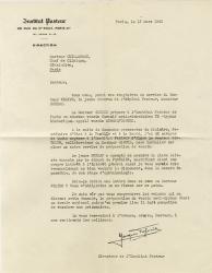 TREFOUËL JacquesLettre signée, adressée au docteur Guillaumat. Paris, 13 mars 1942 ; 1 page in-4° sur papier à en-tête de l'Institut Pasteur, enveloppe jointe. « Le docteur Giroud prépare à l'institut Pasteur de Paris, un nouveau vaccin formolé anti-rickettsies TH-typhus historique appelé vaccin Durand/Giroud. A la suite de demandes pressantes du Ministre, Secrétaire d'état à la Famille et à la Santé, j'ai dû envoyer de toute urgence à l'Institut Pasteur d'Alger le docteur Panthier, collaborateur du docteur Giroud, pour installer sur place un autre service de préparation de vaccin ».