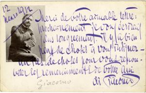 DI GIACOMO SalvatoreCarte autographe signée, adressée à M. André Maurel. 12 mars 1912 ; 1 page in-12 oblongue (carte photographique avec son portrait), adresse timbrée au dos. « Merci de votre aimable lettre : prochainement je vous écrirai plus longuement. Il y a bien peu de choses à vous indiquer — un tas de choses pour vous renouveler les remerciements de votre ami, di Giacomo. »