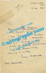 SUPERVIELLE JulesLettre autographe signée. Paris, 12 novembre 1948 ; 1 page in-8°, trace de consolidation avec du scotch invisible. « Je ne vois pas d’inconvénient à ce que la compagnie d’amateurs Le Chouette joue à Marseille ma pièce La Belle aux Bois (et non La Belle au bois dormant). »