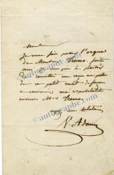 ADAM VictorLettre autographe signée. Sans date ; 1 page in-8°. « Je vous fais passer l’orgue de Monsieur Bruno. Faites-moi, je vous prie le plaisir, de remettre un reçu au porteur de ce petit mot, de façon à couvrir ma responsabilité envers M. Bruno. »