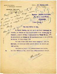 COURTELINE GeorgesPièce autographe signée de 6 lignes sur une lettre à lui adressée par Marcel Ballot de la Société des auteurs et compositeurs. Paris, 16 janvier 1919 ; 1 page in-4°. Il lui est demandé son consentement pour donner en province pendant 18 mois l’exclusivité des représentations pour Le « Train de 8 h 47 ». Courteline dit que c’est « impossible Le Train de 8 h 47 est, pour un certain temps encore, la propriété de Chartier qui l’exploite ».
