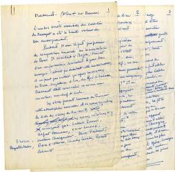 BONDEVILLE EmmanuelManuscrit autographe « Massenet ». 3 pages in-4°. Emmanuel Bondeville a préparé ce document pour une émission radiophonique sur Jules Massenet. « L’un des traits essentiels de Massenet a été la haute valeur de son enseignement. Pendant 18 ans, il fut professeur de composition musicale au Conservatoire de Paris. Il succédait à Bazin, tenant d’un conformisme somnolent et, pour bien marquer l’attrait que suscitait cette nomination, il ne faut pas oublier qu’après les créations de Marie-Magdeleine, d’Eve du Roi de Lahore, Massenet était considéré comme un innovateur, un chef d’école. »