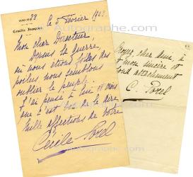 SOREL Cécile (Céline Seurre, dite)Ensemble de 2 lettres autographes signées.— 12 mars 1918; 1 page 1/2 in-12. « J’apprends seulement aujourd’hui par vos remerciements dans les journaux qu’une bombe est tombée devant chez vous. Dieu merci elle vous a épargné et du même coup mon coeur est alarmé et rassuré. »— 5 février 1923 ; 1 page in-8°, à l’encre violette. « Depuis la guerre où nous étions folles des poilus nous semblons oublier le peuple. J’ai pensé à lui et crois que c’est bon de le dire. »