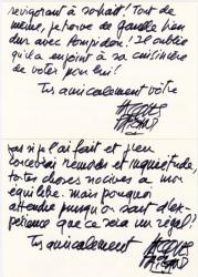 FAIZANT JacquesEnsemble de 2 cartes autographes signées, adressées à Jean-Michel Royer. Sans date et 1990 ; 2 pages in16 oblongues.— Sans date. « Un grand merci pour la lettre ouverte du général [de Gaulle], dont je me promets mille délices. Je vous en remercie avant de l’avoir lue car ensuite je ne me rappellerai pas si je l’ai fait et j’en concevrai remords et inquiétude, toutes choses nocives à mon équilibre. »— 6 septembre 1990. « Je pensais lire la lettre ouverte quand mes polichinelles quotidiens m’en laisseraient le loisir. Et puis ayant, bêtement lu les premières pages, je n’ai évidemment plus pu men départir ! Bravo ! C’est revigorant à souhait ! Tout de même, je trouve de Gaulle bien dur avec Pompidou ! Il oublie qu’il a enjoint à sa cuisinière de voter pour lui ! »