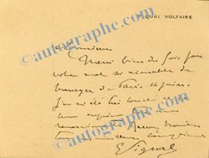 VIGNAL PierreCarte autographe signée. 1 page in-16. Remerciements. « Merci bien, des fois pour votre mot si aimable. »