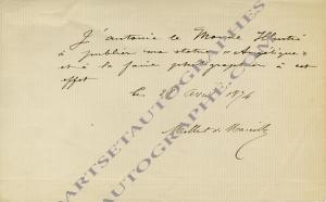 MILLET DE MARCILLY Edouard FrançoisBillet autographe signé. 28 avril 1874 ; 1 page in-12. « J’autorise le Monde Illustré à publier ma statue Angélique et à la faire photographier à cet effet. »