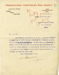DEARLY MaxLettre signée, adressée à Marcel Ballot. 24 août 1917 ; 1 page in-4°. En-tête imprimé « Productions Théâtrales Max Dearly ». « Concernant Trilby, il apparaît que M. Cain a acquis l’autorisation d’adapter la pièce mais non de la faire représenter. Il faut donc que j’acquiers ce droit ; c’est ce que j’ai fait et ce que je fais d’ailleurs pour toutes les pièces anglaises et américaines. Ce n’est qu’une simple formalité qui, en l’espèce, ne peut porter aucune atteinte aux intérêts de notre ami Henri Cain. »