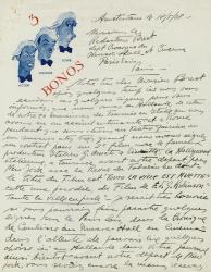 BONOS Victor, Louis et JohnnieLettre autographe signée de Johnnie Bonos, adressée à R. Brest. Amsterdam, 18 mai 1938; 1 page 1/2 in-4° sur papier à en-tête illustré. Il expose les tournées faites en Italie, évoque les parodies qu’ils vont tourner au cinéma. Il lui demande de faire paraître quelques lignes dans Paris-Soir.On joint une lettre signée au même sur un article qui n’est pas paru.