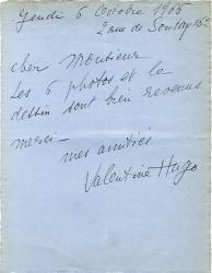 HUGO ValentineLettre autographe signée, adressée au critique dart Georges Boudaille. Paris, 9 octobre 1966 ; 1 page in-4°. « Cher Monsieur, les 6 photos et le dessin sont bien revenus. Merci. Mes amitiés, Valentine Hugo. »