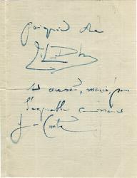 LEVY-DHURMER Lucien (Lucien Lévy, dit)Lettre autographe signée, adressée à la cantatrice Lucie Vauthrin. Sans date ; 2 pages in-12.Lécriture est ici une oeuvre graphique ! « Sincèrement, chère Madame, j'aurai grand plaisir à être des vôtres jeudi 28 ... si longtemps sans nous voir. Donc plein de mercis et pour vous, chère Madame sa grande obligeance.La très cordiale poignée de main deL. L-Dh.et aussi merci pour lagréable connaissance de J. Comte. »