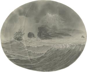 École du XIXe siècle - Marine.Marine. Dessin non signé, à la mine de plomb et craie représentant un navire dans la tempête. XIXe siècle ; 26,5 x 22 cm, de forme ovale. 2 plis verticaux.