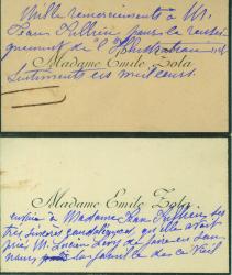 ZOLA Eléonore AlexandrineEnsemble de deux cartes autographes de deuil de madame Emile Zola. Ecrites à l’encre violette. Cartes de remerciements et de condoléances.