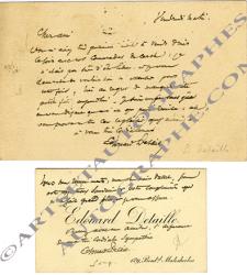 DETAILLE ÉdouardCarte autographe signée, adressée à M. Oudet du Cercle de l’Union artistique. Paris, 28 mai 1886 ; 1 page in-12 oblongue au dos d’un entier postal. Concernant une invitation. « Vous m’aviez très gentiment invité à venir dîner ce soir avec nos camarades du cercle […]. Je suis un peu sans gêne en vous disant que ce n’est que partie remise. » On joint sa carte de visite autographe signée.