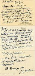 DUNOYER DE SEGONZAC AndréLettre autographe signée, adressée à M. Pierre de Guingand. 24 août 1962 ; sur 3 cartes in-12 oblongues. Il écrit sa correspondance sur 3 cartes représentant des tableaux de sculptures antiques et s’excuse d’avoir tardé à écrire. « Il est très heureux que votre frère Gilbert voit son souvenir évoqué à Versailles par ses œuvres. Je suis très débordé tous ces jours-ci. »