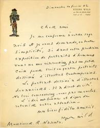 WILLY (Henry Gauthier-Villars, dit)Carte (portrait photographique) autographe signée le représentant. 7 août 1913 ; 14 x 9 cm. « Voulez-vous me faire adresser votre récent voyage à travers les justices de paix de Paris ? Il me serait agréable de parler, soit au Sourire, soit ailleurs, de vos explorations dans les centres .... ? »Le portrait est du studio Stern.