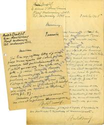 BOURDIL AndréLettre autographe signée, adressée à Raymond Nacenta, directeur de la galerie Charpentier. 8 octobre 1946 ; 1 page in-4°, trous d’archivage.« Monsieur, je vous ai montré au printemps dernier une série de toiles qui vous ont plu beaucoup, je crois. Il y avait parmi elles, un portrait d’André Gide. Monsieur, vous m’avez réservé un accueil tout à fait bienveillant dont j’ai gardé un heureux souvenir. Tout de suite, vous avez proposé de me présenter à Monsieur Bernier qui d’après vous était susceptible de m’exposer. Malheureusement j’ai trouvé la galerie Bernier trop petite pour une exposition de 30 à 40 peintures, le fruit de 15 ans d’efforts. Je vous l’ai écrit et je n’ai plus eu de réponse de vous. » Il est très connu notamment pour son portrait d’André Gide, réalisé en 1943 à Alger, avec qui il joue souvent aux échecs.On joint une lettre autographe signée, au même destinataire, le remerciant de l’intérêt qu’il veut bien lui porter.