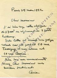 CERIA Edmondlettre autographe signée, adressée à Raymond Nacenta, directeur de la galerie Charpentier Paris, le 25 mars 1952 ; 1 page in-4°, trous d’archivage. « J’ai bien reçu votre chèque de 117 000 F en règlement de 2 petits tableaux. Votre lettre est arrivée avec quelques retards car elle portait 10 rue Tassigny et mon adresse est 10 rue Cassini. »