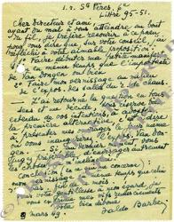VALDO BARBEYLettre autographe signée, adressée à Raymond Nacenta, directeur de la galerie Charpentier. Paris, 9 mars 1949 ; 1 page in-16, adresse au dos, trous d’archivage. « 1° Faire débuter ma petite manifestation en même temps que l’importante de Van Dongen ou bien 2° Faire mon vernissage au milieu de l’expos. des salles du r. de chaus. J’ai retourné la question en tous sens et me décide, sous réserve bien entendu de vos intentions, à adopter la première alternative, c’est-à-dire à présenter mes ouvrages le jour même où vous inaugurerez l’exposition Van Dongen. Si au dernier moment, vous jugez préférable d’envisager autrement les choses, je m’inclinerai. »