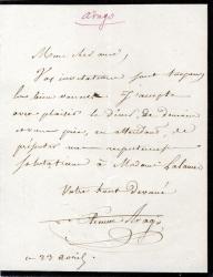ARAGO ÉtienneBillet autographe signé. « Ce 23 avril » ; 1 page in-18 sur papier de deuil. « Vos invitations sont toujours les bienvenues. J’accepte avec plaisir le dîner de demain et vous prie, en attendant, de présenter mes respectueuses salutations à Mme Lalanier. »
