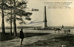 FARMAN HenriPhotographie signée. [1908] ; 9 X 14 cm. Photographie (carte postale) le représentant sur son monoplan en vol au départ de Bouy le 30 octobre 1908. Signée postérieurement.