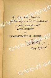 HUGUET Jean« SAINT-EXUPÉRY OU L’ENSEIGNEMENT DU DÉSERT». Éditions la Colombe. 1956 ; 120 X 187 mm. Envoi autographe signé : « À Lucienne Gaulin, en hommage amical et confraternel, ce petit, mais fervent Saint-Exupéry ou l’enseignement du désert. J. Huguet. Paris, 25/6/56. »