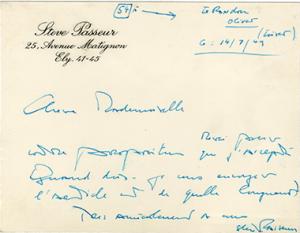 PASSEUR Steve (Étienne Morin, dit)Carte autographe signée. 14 juillet 1949 ; 10,5 x 13,5 cm, avec adresse gravée. « Merci pour votre proposition que j’accepte. Quand dois-je vous envoyer l’article et de quelle longueur ? »