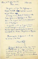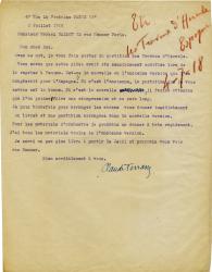 TERRASSE ClaudeLettre signée, adressée à M. Ballot. Paris, 2 juillet 1918 ; 3/4 page in-4°. « Avec ce mot, je vous fait porter la partition des Travaux d’Hercule. Vous savez que cette pièce avait été sensiblement modifiée lors de la reprise à Femina. Est-ce la nouvelle ou l’ancienne version que l’on adapterait pour l’Espagne ? Si c’est l’ancienne, la partition que je vous envoie est la bonne », etc.