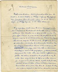THÉRIVE André (Robert Puthoste, dit)Manuscrit autographe signé « Les livres ». [1936] ; 7 pages in-4°. Article de critique littéraire pour sa chronique Les livres dans le journal Le Temps.Il évoque les dernières parutions : Waldemar-George : L’humanisme et l’idée de patrie (Fasquelle) ; Édouard Krakowski : La France et la mission (Mercure de France) ; Paul Gaultier : L’âme française (Ernest Flammarion) ; Brice Parain : Retour à la France (Grasset).