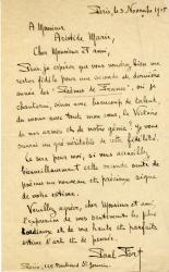 FORT PaulLettre autographe signée, adressée à Aristide Marie [1862 - 1938], essayiste, spécialiste de Gérard de Nerval et avoué français. Paris, 3 novembre 1915 ; 1 page in-8°.« Puis-je espérer que vous voudrez bien me rester fidèle pour une seconde et dernière année des “Poèmes de France”, où je chanterai, sinon avec beaucoup de talent, du moins avec tout mon coeur, la Victoire de nos armes et de notre génie ? […] Ce sera pour moi, si vous accueillez bienveillamment cette seconde suite de poèmes un nouveau et précieux signe de votre estime. »
