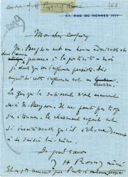ROSNY l’aîné (Joseph-Henri Boex, dit)Lettre autographe signée, adressée à Gaston Picard. 1913 ; 1 page in-12, adresse au dos.« M. Bergson est un homme admirable et dont l’oeuvre passera à la postérité, mais je doute que son influence persiste. Dès aujourd’hui cette influence est un leurre. Les gens qui la subissent n’ont aucunement saisi M. Bergson. Il ne faut pas trop s’en étonner. Ce charmant esprit est si insaisissable qu’il échoue souvent à se saisir lui-même. »