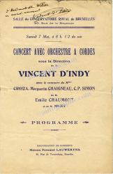 INDY Vincent d’Dédicace autographe signée. Sans date ; 2 pages in-4°. Il s’agit du programme du concert avec orchestre à cordes sous la direction de Vincent d’Indy du samedi 7 Mai à 8 h 1/2 du soir à la salle du conservatoire Royal de Bruxelles. « À Mademoiselle Wiener, en amical souvenir. Vincent d’Indy. »