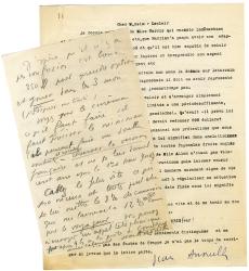 ANOUILH JeanLettre signée, adressée à M. Leclair de la Société des Auteurs et Compositeurs. Sans date ; 1 page in-4°. « Je reçois une lettre de Miss Harris qui raconte la même chose et dit que laffaire va rater, etc., que Harris na pas pu avoir son adaptateur et quil est à Hollywood et quil est bien capable de saisir cette occasion de laisser tomber la pièce et de reprendre son argent [ ]. Il y a tout de même un certain bon sens là-dedans sur le terrain de largent puisque le 10 du mois prochain il doit ou avoir représenté la pièce ou reverser 350 dollars si je ne me trompe pas. [ ] Mon avis est puisque nous réduisons ainsi nos prétentions que nous pourrions laisser le contrat courir en lui signifiant dans une lettre recommandée que nous nous réservons de toutes façons les droits anglais au bout de telle période [ ]. Si la pièce marche, il donnera sûrement signe de vie soit en montant la pièce soit en cherchant à régulariser sa situation vis à vis des droits anglais. » On joint une autre lettre au même. Sans date ; 2 pages in-8°, au crayon. Lettre en rapport avec ses droits dauteur et ses droits cinématographiques.