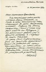 ARIKHA AvigdorLettre autographe signée, adressée au critique dart Georges Boudaille. Paris, 26 janvier 1962 ; 1 page in-8°. « Très touché par votre petite critique dans Cimaise, je tiens à vous remercier bien vivement de votre favorable accueil. Même les deux coquilles (dont lune me fait naître en Pologne !) ne peuvent pâlir vos sui gentils propos à légard de mon travail. Je vous suis infiniment gré et tout en espérant avoir le plaisir de vous rencontrer, je vous prie dagréer cher Monsieur Boudaille, mes sentiments de profonde gratitude. Arikha. »