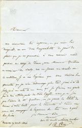 DUMAS Jean-BaptisteLettre autographe signée. Sans date ; 1 page in-8°. « Vous verrez par la lettre le précis ci-joint qu’un pauvre compatriote en appelle à une bienveillance dont j’avais été heureux de lui donner une preuve qu’il n’a pu accepter dans le tems. Vous pouvez […] le connaître, car il a habité Argenteuil. Je n’ai pas besoin d’ajouter que je serais très sensible à ce que vous feriez pour lui. »