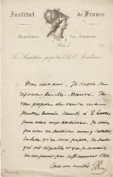 DUMAS Jean-BaptisteLettre autographe signée. Sans date 187... ; 1 page in-8°, en-tête « Institut de France Académie des Sciences ». « Je reçois la réponse de M. Mauré. Je vous propose de venir me prendre demain samedi à 2 heures pour aller aux archives. Je crains que nous ne puissions nous y installer, la salle quon nous propose, la seule qui soit disponible et que je connais ne me parait pas suffisamment close. »