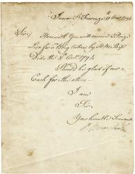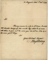 DEBBIEG HughLettre autographe signée. 1er octobre 1799 ; 1 page in-4°, en anglais. « Having occasion to write to M. Adam, I enclosed M. Tuesdales receipt for this months Pay which he of course will deliver to you, and the sooner you can send me £ 20..8..0 the more you l' oblige. »