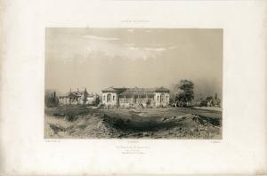 SAINTE-HÉLÈNE.Gravure ancienne montrant une vue du New Longwood. Lithographie de H. Clerget d'après une peinture d'Adolphe d'Hastrel. XIXe siècle ; 28,5 cm x 44 cm. Lithographie tirée de « L'Album d'artiste ». Longwood House est située sur une plaine exposée au vent à 6 km de Jamestown. Ancienne résidence d'été du Lieutenant-Gouverneur de l'île, elle fut réservée à l'usage de Napoléon en 1815. Le gouvernement britannique reconnaissait qu'elle était inadéquate pour être la résidence de l'ancien empereur et son entourage, et au moment de sa mort il venait de construire une nouvelle maison à proximité, New Longwood, mais que Napoléon n'occupa jamais.