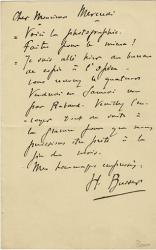 BUSSERLettre autographe signée. « Mercredi » ; 1 page in-8°. « Voici la photographie. Faites pour le mieux ! Je suis allé hier au bureau de copie à l'Opéra. Vous recevrez le quatuor vendredi ou samedi revu par Rabaud. Veuillez l'envoyer tout de suite à la gravure pour que nous puissions être prêts à la fin du mois.»