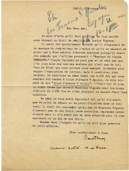 TERRASSE ClaudeLettre signée, adressée à M. Ballot. Paris, 9 octobre 1918 ; 1 page in-4°. « Je suis d'avis qu'il faut profiter de tous motifs nous donnant un droit de résilier le traité Viguera. Il avait été parfaitement entendu qu'il s'agissait de la musique de l'oeuvre et qu'il ne saurait en aucun cas y être adjoint d'autres musiques puisqu'il avait été entendu que l'affiche porterait : Musique de Claude Terrasse. Claude Terrasse ne peut pas et ne veut pas que l'on joue sous son nom une musique qui n'est pas de lui », etc.