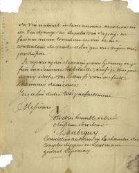 DAUBIGNY DIT VILLAIN DAUBIGNYLettre autographe signée à MM. Neave et Willet négociants à Londres. Paris 31 juillet 1770 ; 3 pages petit in-4°, adresse au verso du dernier feuillet, cachet de cire rouge, annotations anciennes en italien sur le même feuillet (brunissures marginales et petite déchirure par bris du cachet). À propos de l’expédition de cent bouteilles de vin de champagne non mousseux. Il les a fait envoyer d’Épernay vers Calais, selon les instructions de Mme Bracq, et en fixe le prix à 50 sols la bouteille plus le prix du transport en paniers paillés. Il espère qu’ils seront satisfaits de ces vins : « ils sont de mon cru qui est un des meilleurs de la Champagne. [...] Ce dont vous serés assuré avec moy ce sera d’avoir du vin naturel et sans aucune mixtion ni de vin étranger ni de petit vin du paÿs, ne faisant aucun commerce de vin et me contentant de vendre celui que mes vignes me produisent ». Daubigny est alors conseiller auditeur en la chambre des comptes de Paris et lieutenant général d’Épernay. Républicain actif dès les débuts de la Révolution, il sera condamné à la déportation après l’attentat de la rue Saint-Nicaise en décembre 1800 et mourra à Cayenne quatre ans plus tard.