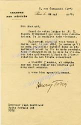 TORRÈS HenryLettre signée, adressée à Jean Desthieux. Paris, 28 mai 1936 ; 1 page in-8° sur papier à en-tête de la Chambre des députés. En tant que député des Alpes-Maritimes : « Il faudra évidemment que nous nous rencontrions. Je le souhaite très vivement. » Il ne pourra venir dans le département avant la fin du mois prochain « dans l’obligation où je suis de m’occuper très activement à Paris de l’invalidation de mon triste concurrent ». Peu commun.