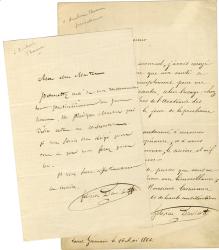 DAVID Félicien-César2 lettres autographes signées, adressées à Ambroise Thomas. Saint-Germain-en Laye, 16 mai 1866 ; 2 pages in-8° et in-12. Lettre de recommandation d’élèves au Conservatoire. « Jusqu’à ce moment, j’avais essayé de conserver l’espoir que ma santé se rétablirait assez promptement pour me permettre de me présenter, selon l’usage, chez chacun des membres de l’Académie des Beaux-Arts, avant le jour de la prochaine élection. Je me vois condamné à renoncer entièrement à cette espérance, et à vous témoigner, ici de nouveau, le sincère et vif regret que j’en éprouve ».
