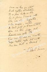 DUMAS CharlesLong poème autographe, signé « Le Poète inconnu ». 5 pages in-4°. Intitulé « Élévation ».« Aujourd’hui j’ai gravi la montagne. Aujourd’huiJ’ai bu tout l’or du ciel pour en cribler la nuitRouge sombre de ma souffrance ;Je suis monté le front courbé, si triste et lasMais j’avais soif d’être là-haut, puisque là-basOndulait l’horizon de FranceAh ! Là-haut, ce serait l’air libre, l’océanDe lumière où mon cœur, dont un spasme géantFait craquer l’ardente carèmeOù mon cœur bondissant, fou d’orgueil, aigle et roiDéferlerait sa voile ou ses ailes en moiComme une pourpre souveraine.[...]Le Poète Inconnu.»