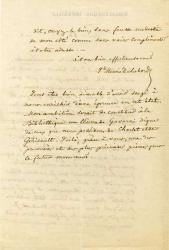 DELABORDE HenriLettre autographe signée. Paris, le 26 octobre 1863. 2 pages in-8°. En-tête gravé « Bibliothèque Impériale ». « En disant un mot de vos très utiles travaux, je n’ai fait que rappeler les enseignements que chacun de nous y a trouvés et le profit que j’en ai tiré moi-même. Il n’y a eu en cela de ma part ni intention de politesse envers vous, ni arrière-pensée d’amitié […]. J’ai voulu être et j’ai été tout simplement sincère ; et j’ai signalé ce que vous avez fait, parce que ce que vous avez fait est, à mon avis, méritoire. Vous savez d’ailleurs que je ne vous tiens par quitte de votre dette en ce qui concerne l’histoire de la lithographie et que je vous ai déjà sommé de l’écrire tout entière. Voilà qui vous revient de droit. Je n’ai fait, moi, que la préface du livre qu’il vous appartient de nous donner.» En post-scriptum, il rajoute qu’il aimerait constituer un ouvrage sur Gavarni digne de ceux sur Géricault et sur Charlet que possède la bibliothèque. Jolie lettre.