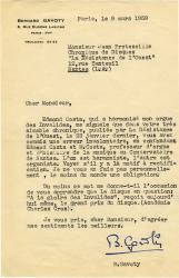 GAVOTY BernardLettre signée, adressée à M. Jean Preteseille. Paris, 9 mars 1959 ; 1 page in-8°. En-tête imprimé à son nom et adresse. « Edmond Costa, qui a harmonisé mon orgue des Invalides, me signale que dans votre très aimable chronique, publiée par la Résistance de l’Ouest, […] vous avez commis une erreur involontaire en confondant Edmond Costa et M. Costa, professeur d’orgue et d’histoire de la musique au Conservatoire de Nantes. L’un est harmoniste, l’autre est organiste. »
