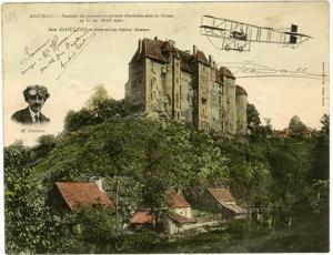DAILLENS JeanPhotographie signée. 14 X 18 cm. Carte postale coloriée, représentant son biplan au dessus du château de Boussac, signée. On joint une autre carte postale avec son biplan Sommer en vol et une photographie de lui.