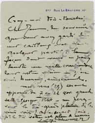 LEVY-DHURMER LucienLettre autographe signée, adressée à l’écrivain François de Bondy. Paris, 25 octobre 1924 ; 1 page in-12, adresse timbrée. Il est touché du souvenir « que vous avez gardé de mes cailloux et des quelques pastels : la façon dont vous en parlez dénote une réelle correspondance dans notre vision. […] Mes nus (25) seront exposés du 7 au 22 novembre grande salle Georges Petit. Me ferez-vous le très grand plaisir de les venir voir ? »